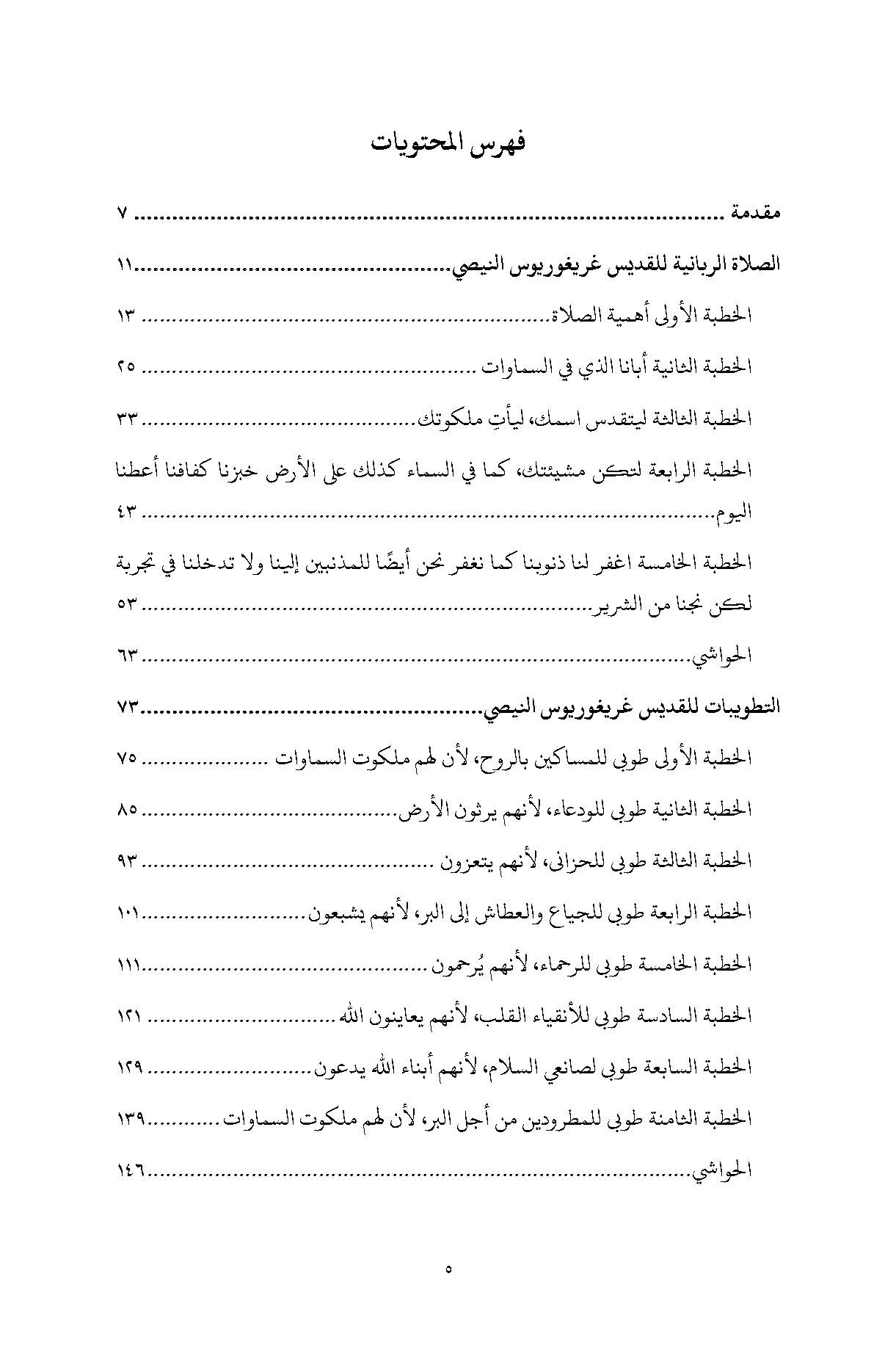 يتضمّن هذا العمل عظات القديس غريغوريوس النيصي عن الصلاة الربّانية والتطويبات، والذي ينتمي إلى فئة كتاباته الرعوية. فهذه الأعمال ليست أطروحاتٍ تأملية، بل نصائح عملية موجهة إلى احتياجات المؤمنين، هدفها إيقاظ السامعين من الغفلة الروحية وحثّهم على الفضيلة وإرشادهم في حياة الصلاة. ويرى غريغوريوس في الصلاة الربانية مسارًا لاستعادة الصورة الإلهية في الإنسان، وفي التطويبات سلّمًا للكمال يقود النفس إلى رؤية الله. وبين الوضوح العملي والعمق الروحي، تتجلّى في هذه النصوص روحُ غريغوريوس الرعوية وقدرته على تطبيق اللاهوت العميق على الحياة اليومية للمسيحيين، لتبقى ذات قيمة دائمة للدراسة اللاهوتية والنمو الروحي.