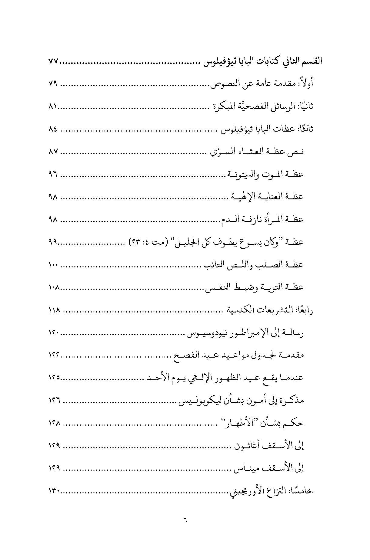 كما يتناول القسم الثاني كتابات البابا ثيؤفيلس، بما في ذلك عظاته اللاهوتية والروحية، ورسائله الفصحية، ونصوصه المجمعية التي تُبرز حسُه الرعوي وفكره العقائدي. إن هذا الكتاب لا يقدّم مجرّد سردٍ تاريخيّ، بل يفتح أمام القارئ نافذة على حقبة مفصليّة أسهمت في تشكيل اللاهوت السكندري.